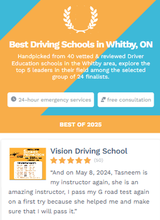 We scored 40 Durham Region Area Driver Education schools across a variety of salient criteria, and Vision Driving School has been recognized as the Top Driving School in Whitby. We want to reward your outstanding success and commitment to excellence, so we are placing a ribbon on your profile and quotes.